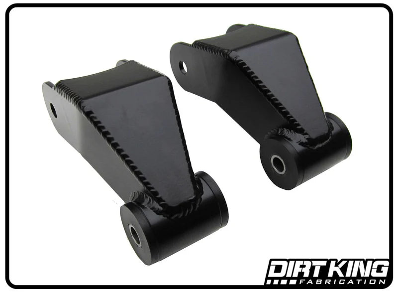 The Dirt King long travel shackles are a great upgrade to replace the factory shackles which are prone to failing. The shackles allow for additional down travel when paired with long travel leaf springs. They are CAD designed and constructed using 3/16" thick steel. The shackles drop the rear ride height ¾” to help level the vehicle. They also have grease ports to easily service the bushings.